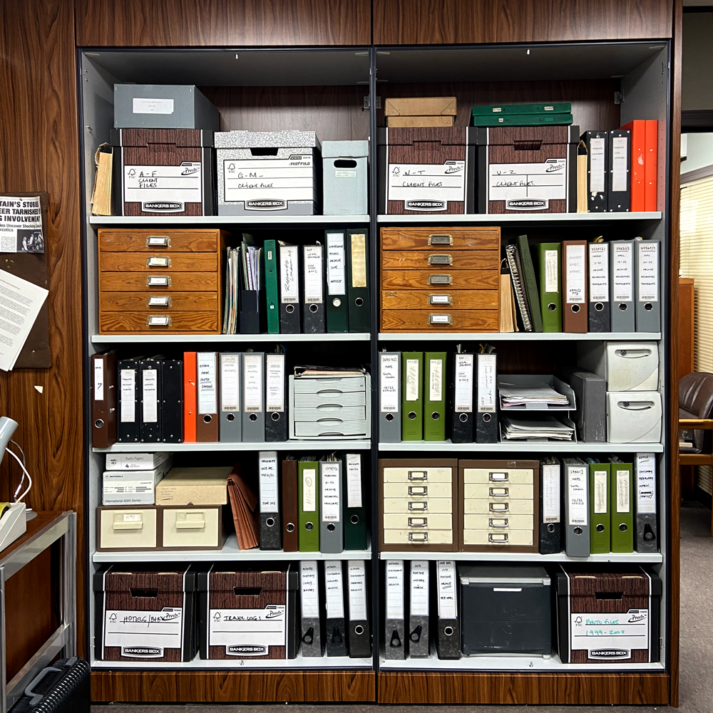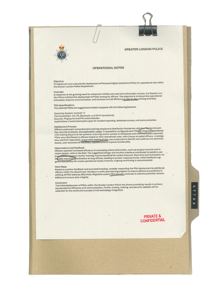 Paperwork, handwritten notebooks, labels, file end designs for investigation office.