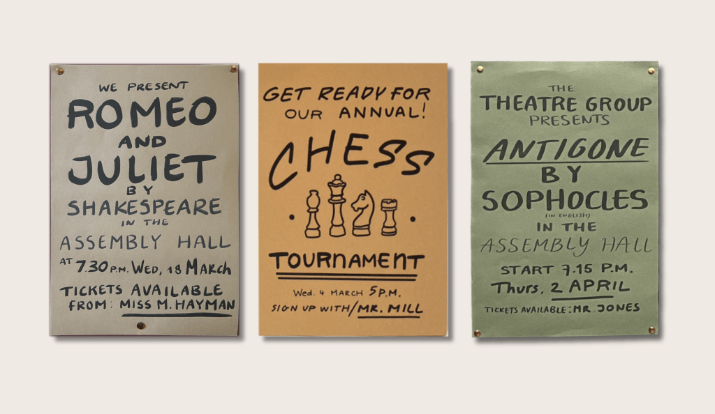 Handwritten posters for a school set in the 1960s.