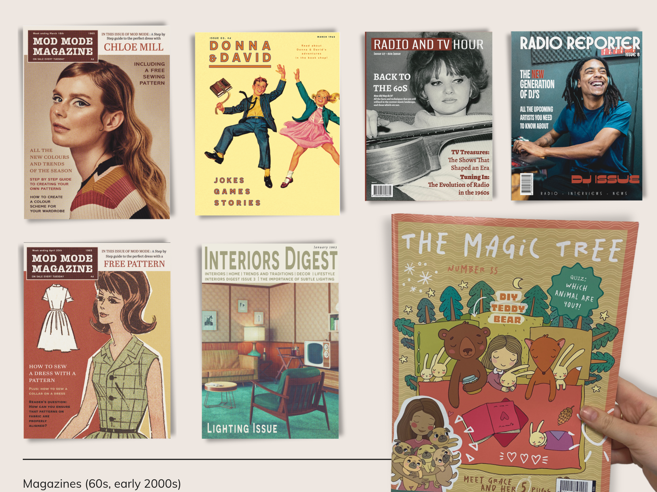 Various magazine cover designs for different time periods.